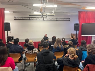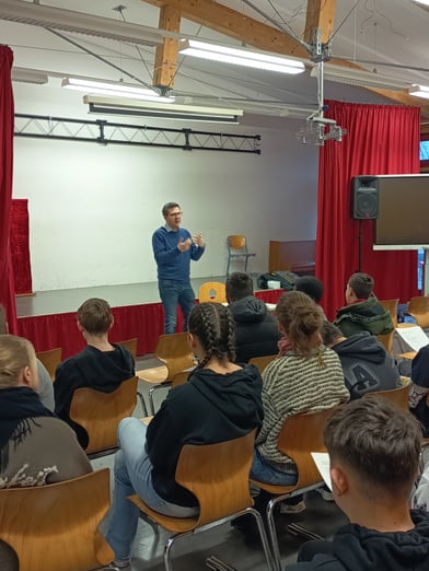 Am Montag, dem 26.01.2026 besuchte uns Herr Marcus Klein (CDU). Die Klassen 7, 8 und 9 trafen sich dazu in der Aula. Im Vorfeld überlegten wir uns Fragen. Herr Klein erzählte uns von seinem Privatleben, von seinen Kindern und dass er in seiner Freizeit gerne wandert, Fahrrad fährt oder grillt und kocht. Er ist natürlich FCK- Fan. Auch Fragen zum Angriffskrieg Russlands auf die Ukraine, zum amerikanischen Präsident Donald Trump und zur AFD beantwortete er.