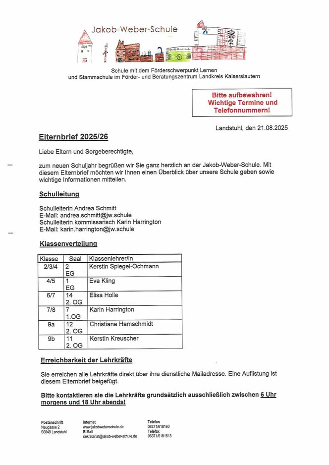 Hier unser erster Elternbrief mit wichtigen Telefonnummern und Terminen.